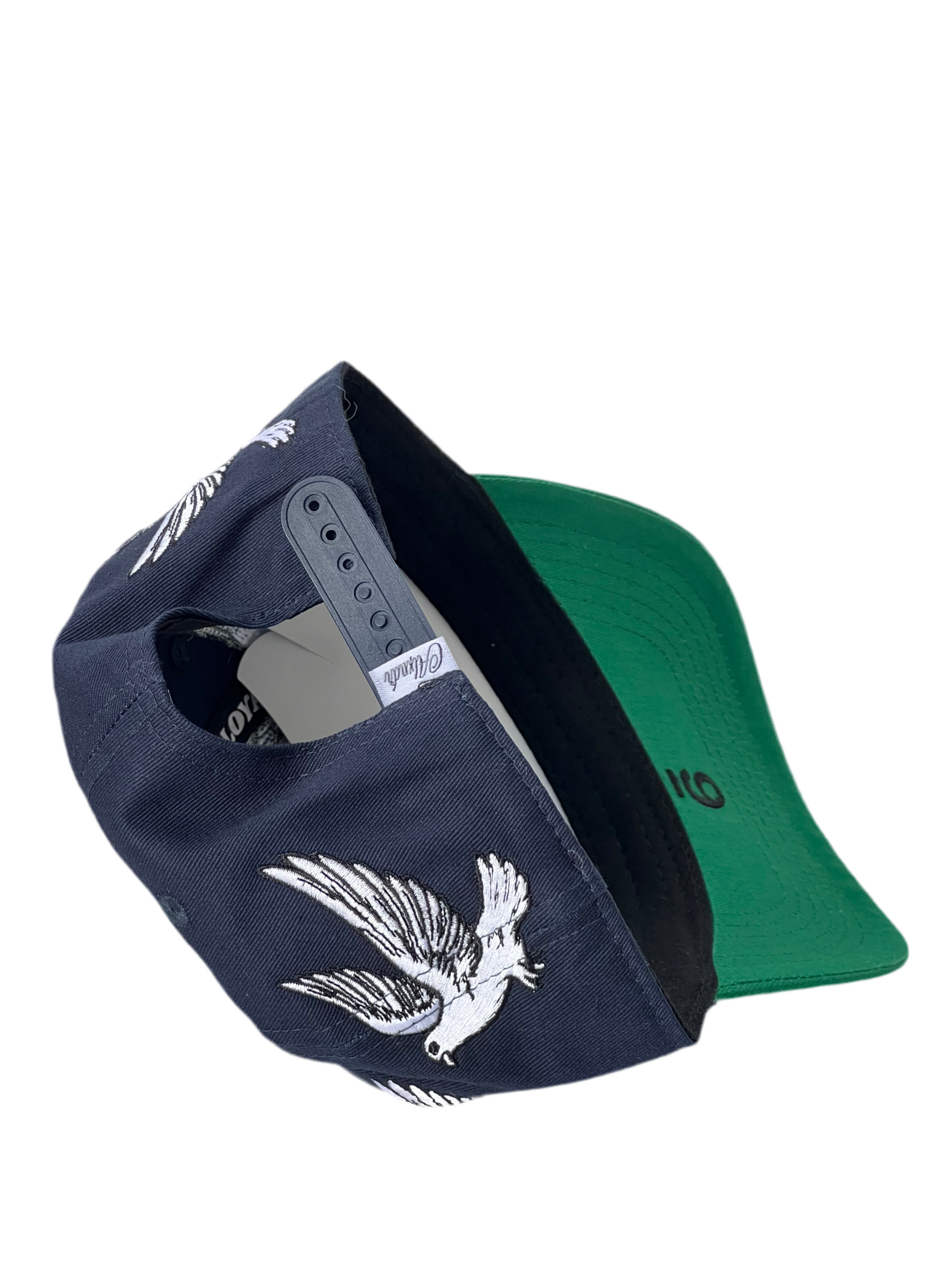 Elevate your streetwear game with the Love Flight Signature Snapback in a navy blue & green. This cap blends classic style with elevated symbolism, featuring bold white embroidery of soaring doves flanking a stylized gothic “A” & backward facing “D” at center stage. The birds represent love, peace, freedom, and vision—values that align with those chasing something higher.